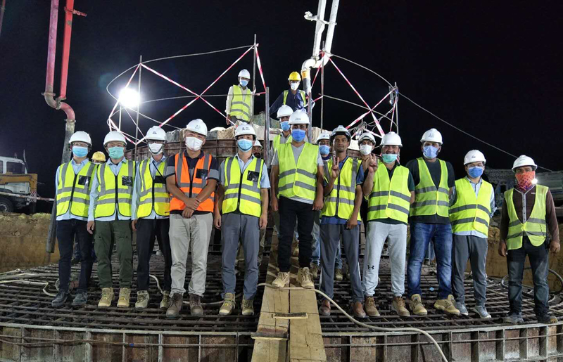 6月后,巴基斯坦進(jìn)入雨季,風(fēng)機(jī)基礎(chǔ)常常因暴雨而充滿積水,場內(nèi)道路也被沖壞。每次暴雨過后,項(xiàng)目部立即組織大量人力和設(shè)備進(jìn)行排水和除銹處理,修復(fù)場內(nèi)道路,這才保障了雨季期間基礎(chǔ)澆筑施工的不間斷。此外,項(xiàng)目部從風(fēng)機(jī)承臺澆筑的工序入手,認(rèn)真分析風(fēng)機(jī)承臺澆筑工序的時間和關(guān)鍵工序,制定鋼筋綁扎夜間施工專項(xiàng)施工方案,并組織兩班鋼筋綁扎隊伍進(jìn)行施工,大大提升了鋼筋綁扎的速度,有效保障了風(fēng)機(jī)承臺澆筑的施工進(jìn)度。